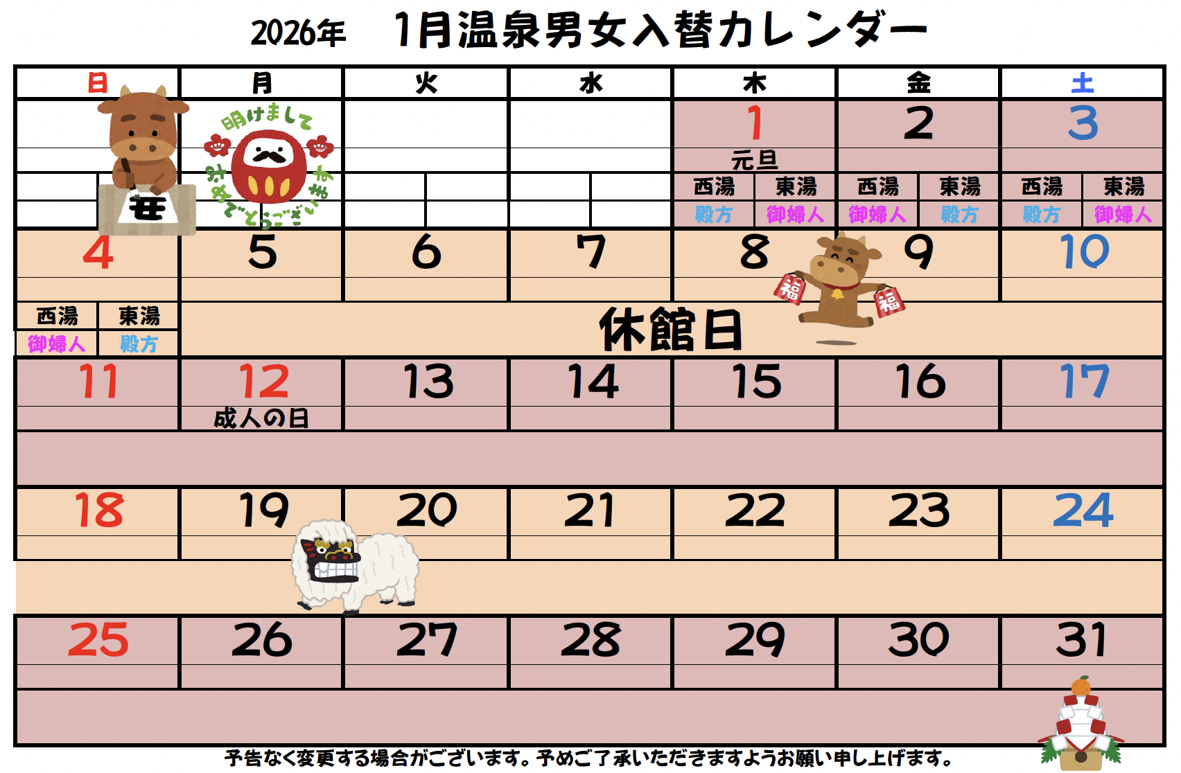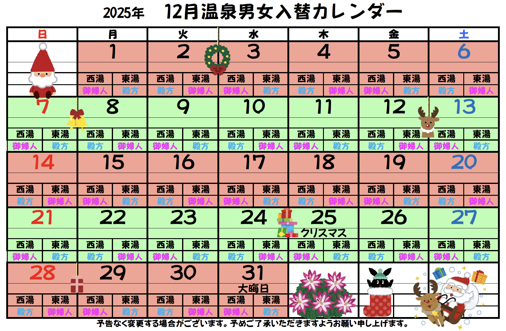 主浴湯・露天風呂・信楽焼壺風呂・炭酸風呂・水風呂・寝ころび湯・サウナ・釜風呂(スチームサウナ)